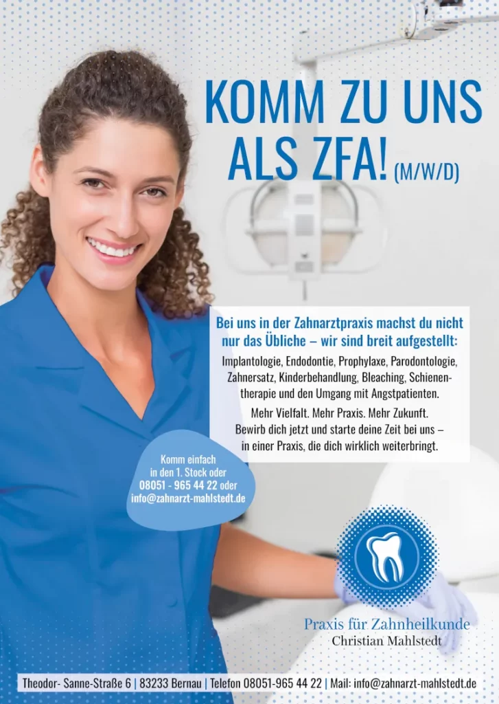 Wir suchen engagierte Persönlichkeiten, die hochwertige Technik und präzises Arbeiten in einem professionellen Umfeld schätzen. Unsere Praxis bietet Ihnen den Freiraum, eigenverantwortlich zu arbeiten und Patienten mit modernsten Behandlungsmethoden ganzheitlich zu betreuen.